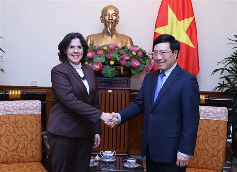| Le vice-Premier ministre et ministre des Affaires étrangères Pham Binh Minh (droite) et l'ambassadrice de Cuba au Vietnam, Lianys Torres Rivera. |