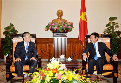 | Le vice-Premier ministre et ministre des Affaires étrangères, Pham Binh Minh (droite), et l'ambassadeur nord-coréen au Vietnam, Kim Myung Gil, le 16 décembre à Hanoi. |
