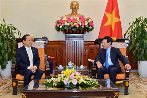 | Le vice-Premier ministre et ministre des Affaires étrangères Pham Binh Minh (droite) a reçu à Hanoi le 26 mai le nouvel ambassadeur du Cambodge au Vietnam, Chay Navuth. |
