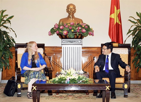 | Le vice-Premier ministre et ministre des AE, Pham Binh Minh, et la vice-ministre néo-zélandaise des Affaires étrangères et du Commerce, Andrea Smith, le 16 octobre à Hanoi. Photo : Pham Kiên/VNA/CVN |