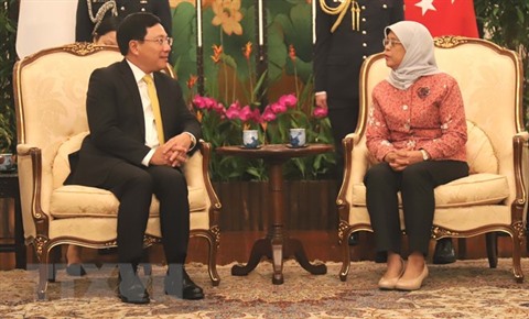 | Le vice-Premier ministre et ministre des Affaires étrangères Pham Binh Minh et la présidente de Singapour, Halimah Yacob. |