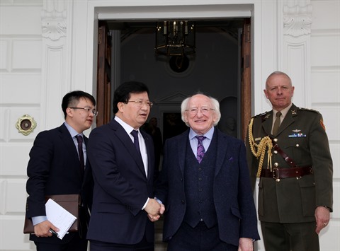 | Le vice-Premier ministre Trinh Dinh Dung (2e à gauche) serre la main au président irlandais Michael D. Higgins, le 21 avril en Irlande. |