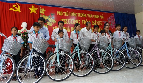 | Le vice-Premier ministre Truong Hòa Binh a offert 100 bicyclettes à des élèves démunis de la province de Cà Mau. |