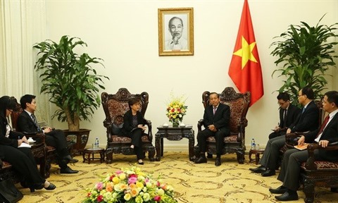 | Le vice-Premier ministre Truong Hoà Binh et l'ambassadrice de Singapour au Vietnam, Catherine Wong Siow Ping, le 6 juillet à Hanoï. |