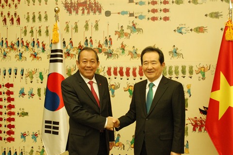 | Le vice-Premier ministre Truong Hoa Binh (gauche) et le président de l'Assemblée nationale de la République de Corée, Chung Sye-Kyun. |