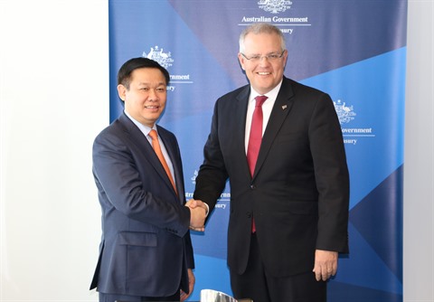 | Le vice-Premier ministre vietnamien Vuong Dinh Huê (gauche) et le ministre australien du Trésor, Scott Morrison, le 24 juillet en Australie. |
