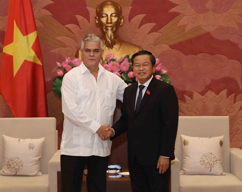 | Le vice-président de l’Assemblée nationale Dô Ba Ty (droite) et le vice-président du Comité de la protection révolutionnaire de Cuba, Orestes Mestre. |