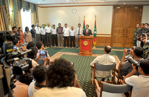 | Le président des Maldives, Mohamed Nasheed, annonce sa démission le 7 février lors d'une conférence de presse télévisée à Male |