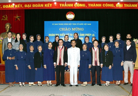 | Le vice-président du Front de la Patrie du Vietnam, Lê Ba Trinh (centre), reçoit le 8 avril à Hanoi une délégation de Sœurs issues d'ethnies minoritaires du groupe Médaille Miraculeuse de la province de Kon Tum. |