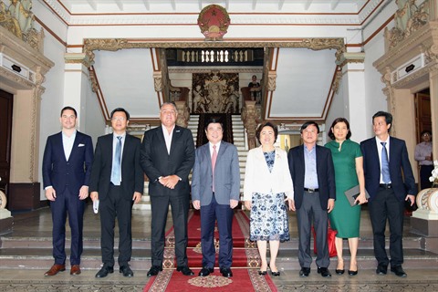 | Le président du Comité populaire municipal de Hô Chi Minh-Ville, Nguyên Thành Phong (centre), a reçu mardi 9 janvier Paul Hutton, vice-président chargé de l’Asie du Sud-Est du groupe Hilton. |
