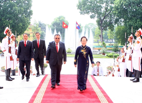 | Le vice-président lao Bounnhang Vorachit et son homologue vietnamien, Mme Nguyên Thi Doan, le 7 juillet à Hanoi. |