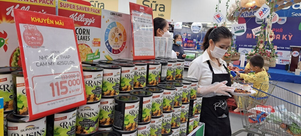 | Raisins secs américains en conserve sur les rayons du MM Mega Market An Phu, à Hô Chi Minh-Ville. |