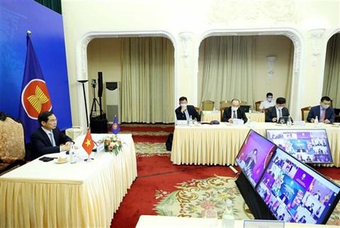 | Le ministre des Affaires étrangères Bùi Thanh Son (gauche) participe, le 4 août, à la 11e conférence virtuelle des ministres des Affaires étrangères du Sommet de l'Asie de l'Est. |