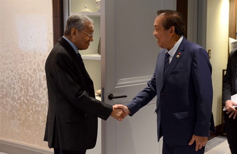 | Le vice-Premier ministre vietnamien Truong Hoà Binh (droite) a rencontré le Premier ministre malaisien Mahathir Mohamad, le 11 juin au Japon. |