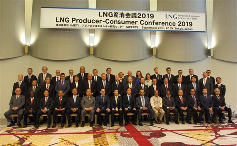| Photo de famille entre les chefs de délégation participant à la Conférence des producteurs et consommateurs du gaz naturel liquéfié (GNL) 2019 à Tokyo. |