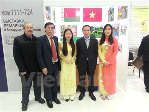 | Des responsables vietnamiens devant le stand du pays lors de la Foire-expo internationale à Gomel, en Biélorussie. |