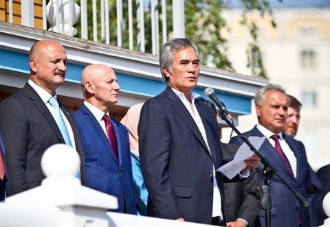 | Nguyên Minh Tri (au micro) à la cérémonie de célébration de la Journée internationale de la paix dans la ville de Krementchoug en Ukraine. |