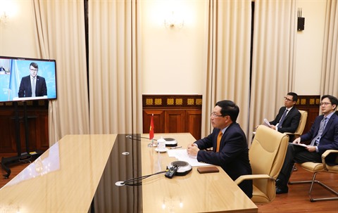 | Le vice-PM Pham Binh Minh lors de la visioconférence, le 8 mai. |