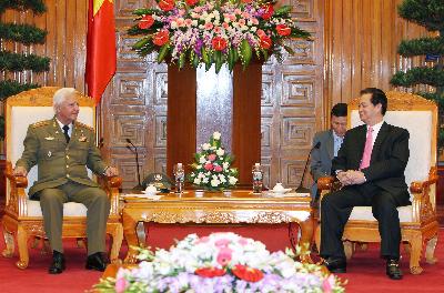 | Le Premier ministre Nguyên Tân Dung (droite) et le vice-ministre des Forces armées révolutionnaires de Cuba, le général Joaquin Quintas Sola |