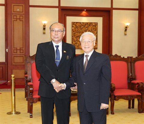 | Le secrétaire général du Parti communiste du Vietnam, Nguyên Phu Trong (droite), et le président du Parlement et du Sénat du Myanmar, Mahn Win Khaing Than, le 15 mai à Hanoï. |