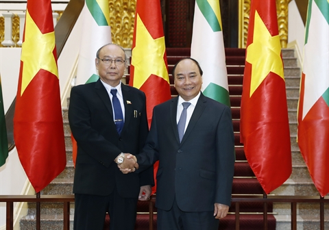 | Le Premier ministre vietnamien Nguyên Xuân Phuc (dtoite) et le président du Parlement et du Sénat du Myanmar, Mahn Win Khaing Than, 15 mai à Hanoï. |