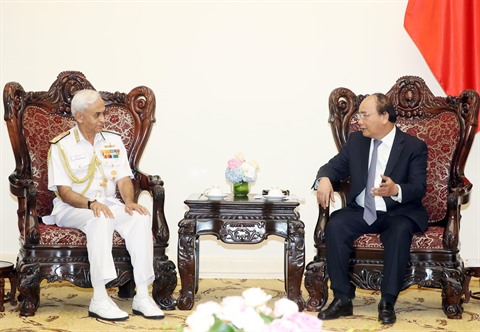 | Le Premier ministre Nguyên Xuân Phuc (droite) et le président du Comité des chefs d’état-major et commandant de l’armée navale indienne, Sunil Lanba, le 4 octobre à Hanoï. |