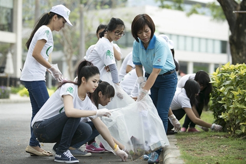 | Des jeunes filles participent au ramassage des ordures dans la rue. |