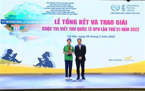 Se mettant dans la peau d'une rafale de vent, Nguyên Binh Nguyên, du collège Nguyên Tri Phuong, s'est épanché auprès du célèbre pianiste Dang Thai Son, partageant son idée d’utiliser la musique pour inciter des réflexions et des actions sur la protection de l’environnement. La lettre de Nguyên Binh Nguyên et sa version en français seront été envoyées au Bureau international d’UPU, à Berne (Suisse), afin de participer au concours international de composition épistolaire de l'Union postale universelle (UPU) 2022. Les organisateurs ont également décerné trois deuxièmes, cinq troisièmes prix, 30 prix d’encouragement, ainsi que deux prix spéciaux pour les candidats handicapés.