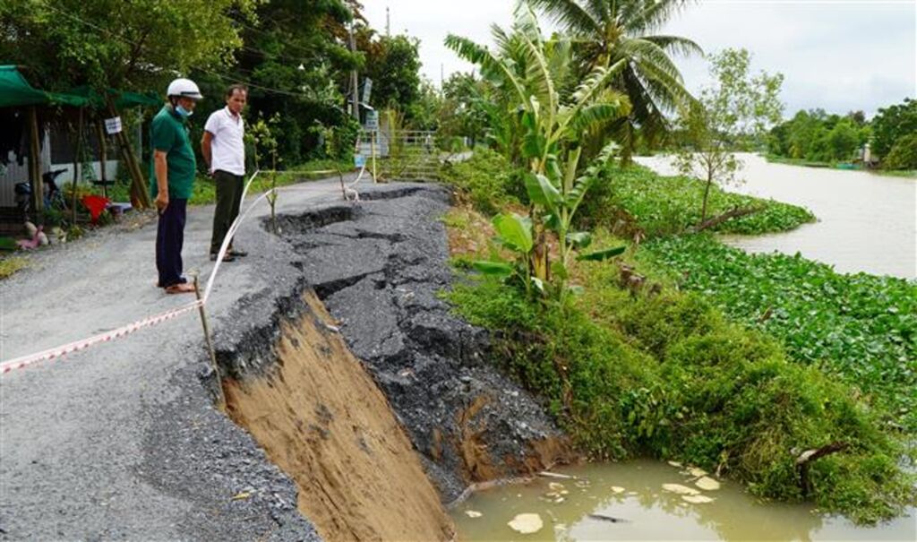 | Une route asphaltée détruite par le glissement des bords de rivière dans la province de Dông Thap (Sud). |