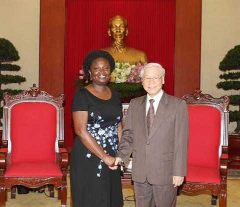 | Le secrétaire général du PCV, Nguyên Phu Trong, reçoit le 30 juin la directrice nationale de la Banque mondiale, Victoria Kwakwa, venue le saluer au terme de son mandat au Vietnam. |
