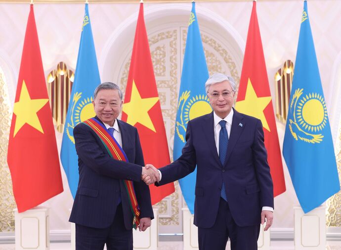 | Le secrétaire général du Parti communiste du Vietnam (PCV), Tô Lâm (gauche), et le Premier ministre kazakh, Oljas Bektenov. |