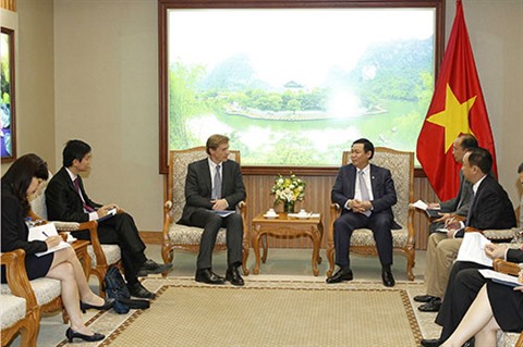 | Le vice-Premier ministre Vuong Dinh Huê (droite) a reçu le 15 novembre à Hanoï Justin Wood, chef de la région Asie-Pacifique du Forum économique mondial (WEF). |