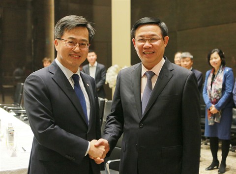 | Le vice-Premier ministre Vuong Dinh Huê (droite) et son homologue sud-coréen Kim Dong Yeon. |