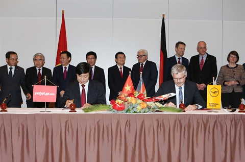 | Truong Tân Sang et les hauts officiels vietnamiens comme allemands à la signature de documents de coopération sur la maintenance des moteurs d'A320, le 25 novembre à Berlin. |