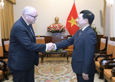 | Le vice-Premier ministre et ministre des Affaires étrangères (AE), Pham Binh Minh (droite), et le secrétaire d’État du ministère fédéral allemand des AE, Andreas Michaelis. |