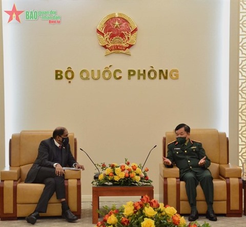 | Le général de corps d’armée Hoàng Xuân Chiên, vice-ministre de la Défense (droite), reçoit l’ambassadeur de Singapour au Vietnam, Jaya Ratnam. |