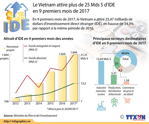 En neuf premiers mois de 2017, le Vietnam a attiré 25,47 milliards de dollars d’investissement direct étranger (IDE), en hausse de 34,3% par rapport à la même période de 2016.