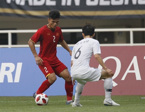 | Le défenseur vietnamien Xuân Manh (gauche) en demi-finale des ASIAD 18 face à la République de Corée, le 29 août au stade de Pakansari, en Indonésie. |