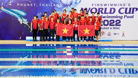 | L'équipe vietnamienne au Finswimming's World Cup Round Swimming Pool 2022, en Thaïlande. |