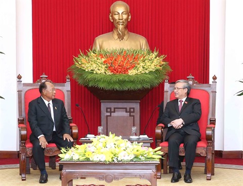 | Le membre du Bureau politique Trân Quôc Vuong, membre permanent du secrétariat du Comité central du PCV (droite) et le président honoraire du Parti du peuple cambodgien et président de l’Assemblée nationale du Cambodge, Heng Samrin.. |