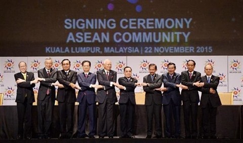 | Les dirigeants des pays membres de l’ASEAN lors de la cérémonie de signature de la Déclaration de Kuala Lumpur de 2015 sur la fondation de la Communauté de l’ASEAN en 2015, vision 2015, le 22 novembre 2015 en Malaisie. |