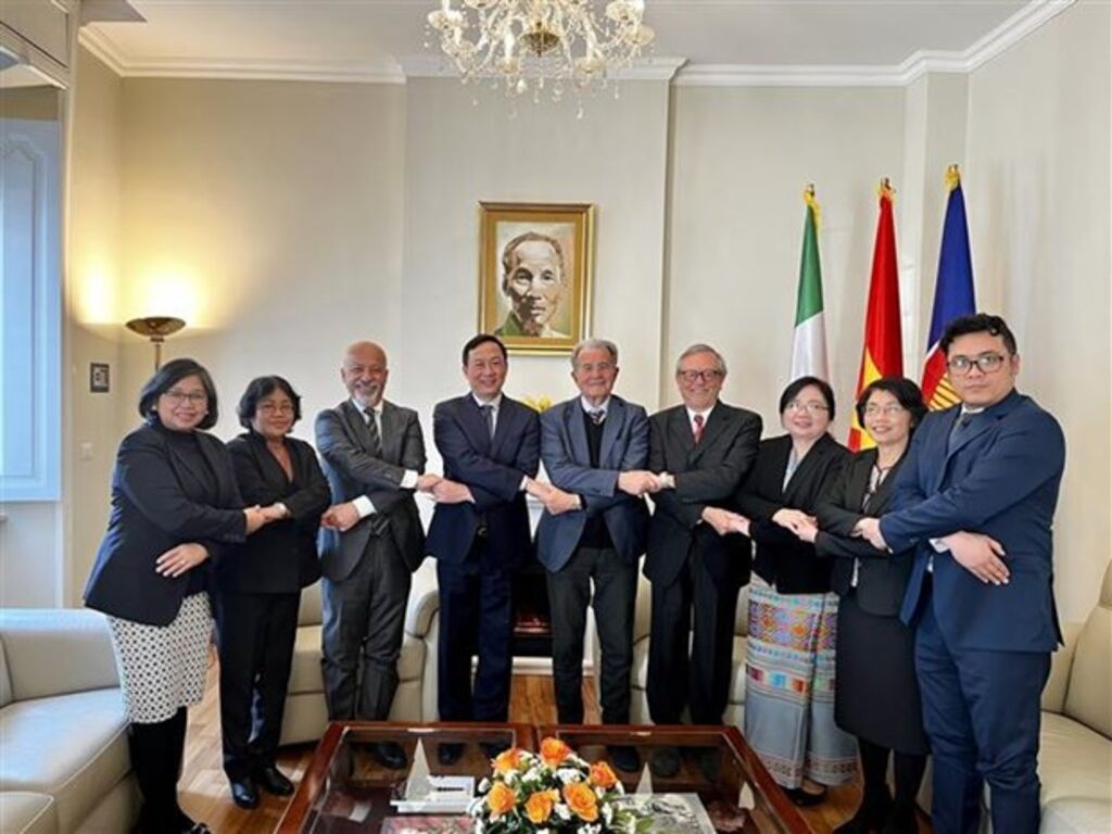 | L'ambassadeur vietnamien en Italie Duong Hai Hung, les ambassadeurs des pays d'ASEAN et les dirigeants du Comité de l'ASEAN à Rome. |