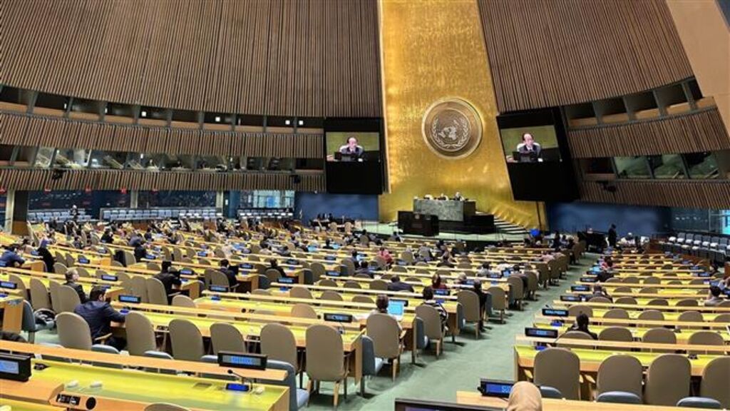 | Lors d'une séance de travail de l'Assemblée générale de l'ONU. |