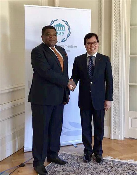 | Duong Chi Dung (droite) et Martin Chungong, le 5 mai à Genève (Suisse). |