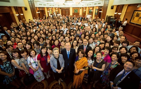 | Le secrétaire général de l'ONU, Ban Ki-moon (centre), en visite au Vietnam en mai 2015. |