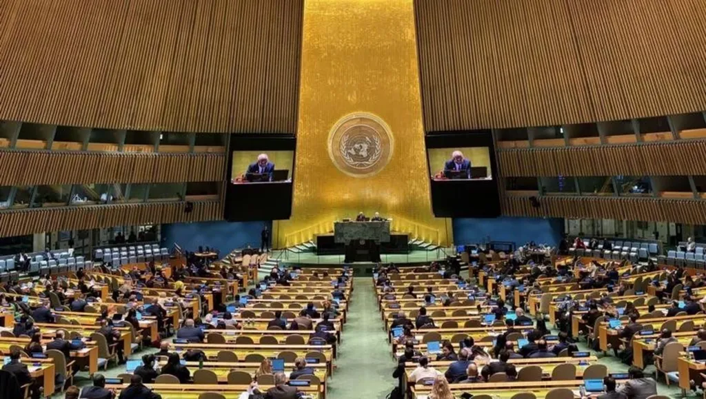 | Panorama d'une session visant à adopter la résolution de l'Assemblée générale des Nations unies. |