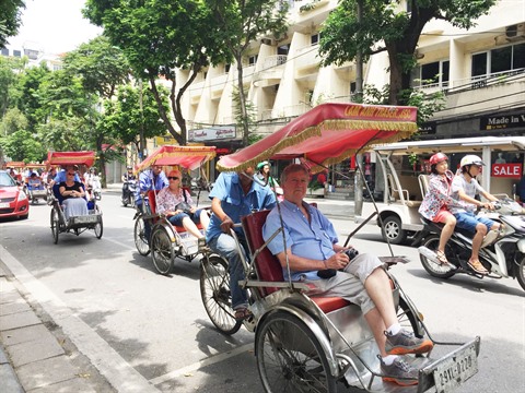 | Des touristes étrangers découvrent la capitale de Hanoï à cyclo. |