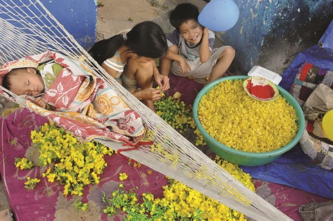 Depuis plus de dix ans, le regard du Suisse McFreddy croise celui des Vietnamiens, "tellement habiles de leurs mains”. Cette photo a été réalisée dans un grand cimetière. Une femme assise près de son dernier-né, entre deux pierres tombales, assemble les fleurs de plastique qui vont illuminer le Têt.