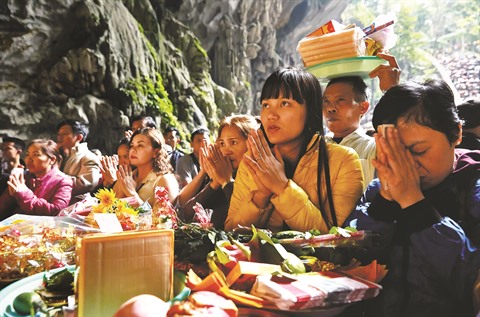 Le Français décrit cette photo : Prières et offrandes devant l’autel dédié à la déesse Quan Âm. À 60 km au sud de Hanoï, l’accès à Chùa Huong (pagode des Parfums) se fait par bateau, à partir de l’embarcadère situé non loin de la Nationale 1. Les jours de fête, les bons rameurs, homme ou femme, convoient en sampan des milliers de visiteurs.