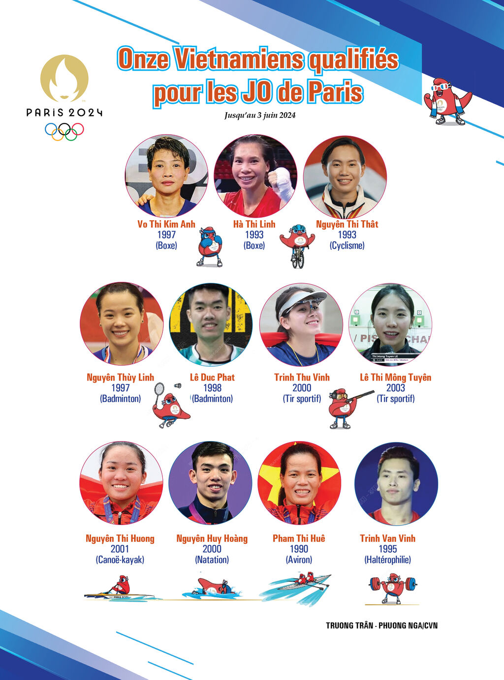 Le Vietnam a donc d’ores et déjà décroché 11 qualifications pour les JO de Paris : Nguyên Thi Thât (cyclisme), Trinh Thu Vinh, Lê Thi Mông Tuyên (tir sportif), Vo Thi Kim Anh, Hà Thi Linh (boxe), Nguyên Huy Hoàng (natation), Trinh Van Vinh (haltérophilie), Nguyên Thùy Linh, Lê Duc Phat (badminton), Nguyên Thi Huong (canoë-kayak) et Pham Thi Huê (aviron).